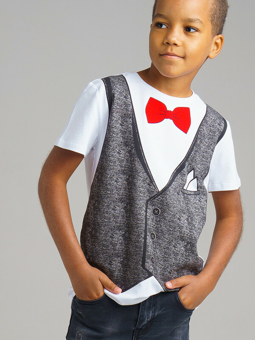 Футболка из качественного приятного на ощупь трикотажа. Высокое содержание хлопка 95%. Благодаря наличию эластана в составе ткани изделие проще в уходе и держит форму. Принт с имитацией жилетки и бабочки. Бабочка тактильная бархатистая. Оригинальное и удобное решение для ребенка в создании праздничного образа.