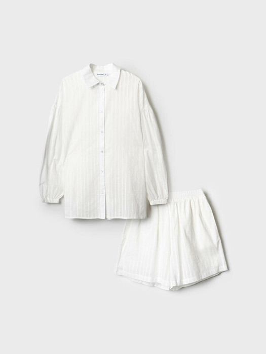 Легкий женский хлопковый костюм. Рубашка оверсайз с длинным рукавом и застежкой на пуговицы. Классический воротник, боковые разрезы. Манжеты на резинке. Свободные шорты на резинке.