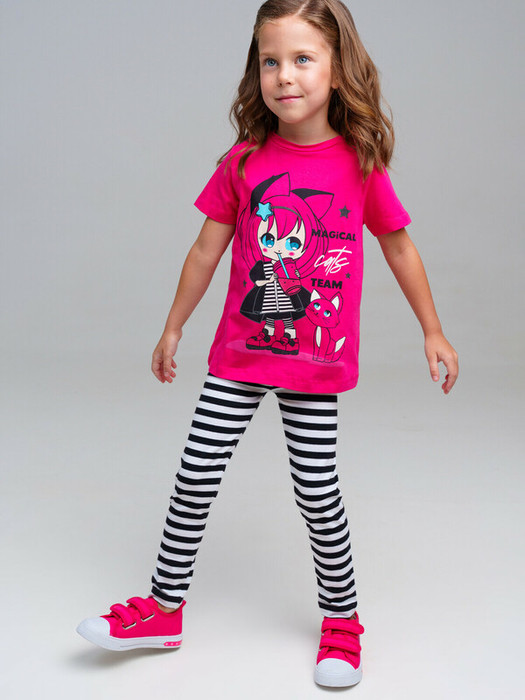 Модный детский костюм для девочки: футболка, брюки из качественного и приятного на ощупь трикотажа джерси. Футболка: высокое содержание хлопка 95%. Благодаря наличию эластана в составе ткани изделие проще в уходе и держит форму. Легинсы из рома джерси. Эластичный пояс. Модель из капсульной коллекции CATS DREAM. Соберите полный образ в едином стиле!  Костюм будет актуален для детского сада, в садик.   Модель выполнена из качественного и приятного на ощупь трикотажа.