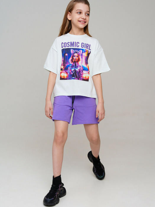 Костюм для девочки подростка. Комплект: оверсайз футболка, шорты с высоким содержанием хлопка 95%. Благодаря наличию эластана в составе ткани изделие проще в уходе и держит форму. Шорты на резинке со шнурком. Боковые карманы.   Модель выполнена из качественного и приятного на ощупь трикотажа.