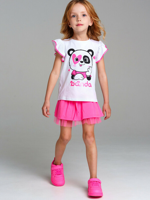 Комплект: футболка и юбка-шорты из качественного эластичного и приятного на ощупь трикотажа. Оптимальная посадка: не сползают при движении. Эластичный пояс. Высокое содержание хлопка. Благодаря наличию эластана в составе ткани изделие проще в уходе и держит форму.