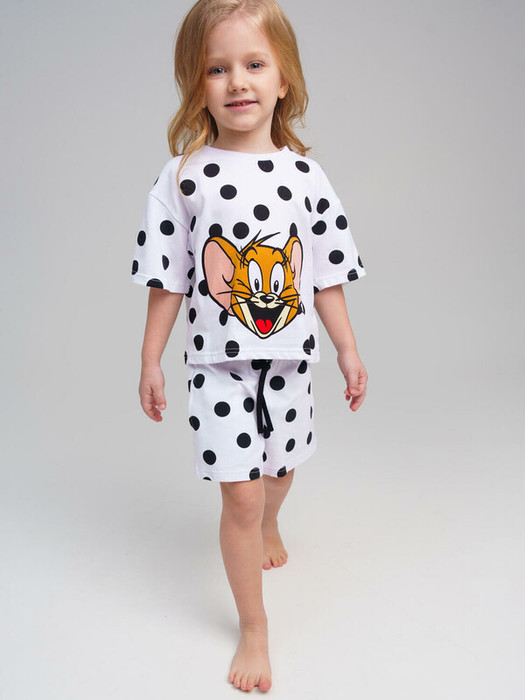 Пижама детская для девочки. Футболка оверсайз и шорты из эластичного и приятного на ощупь трикотажа. Шорты на резинке со шнурком. Высокое содержание хлопка 95%. Благодаря наличию эластана в составе ткани изделие держит форму и меньше мнется.