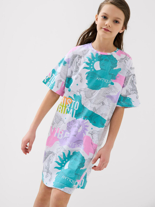 Платье-футболка оверсайз для девочки подростка. Модель длиной чуть выше колена, выполнена из хлопкового трикотажа джерси. Яркие принты.