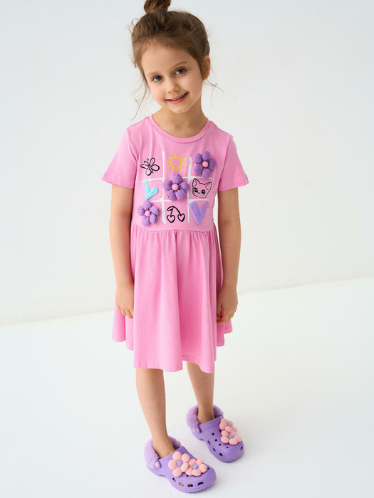 Детское платье для девочки. Модель с короткими рукавами, средней длины — до колена. Выполнено из мягкого хлопкового трикотажа джерси. Верхняя часть прямая, юбка со сборкой по талии создает легкий объем. Украшено красочным принтом.