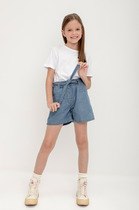 Джинсовые шорты для девочки подростка. Шорты короткие, с модным рваным краем и потертостями. Спереди — карманы и патч, сзади — два накладных кармана и силиконовая нашивка. Шорты застегиваются на болт и молнию. В поясе предусмотрена внутренняя регулировка.
