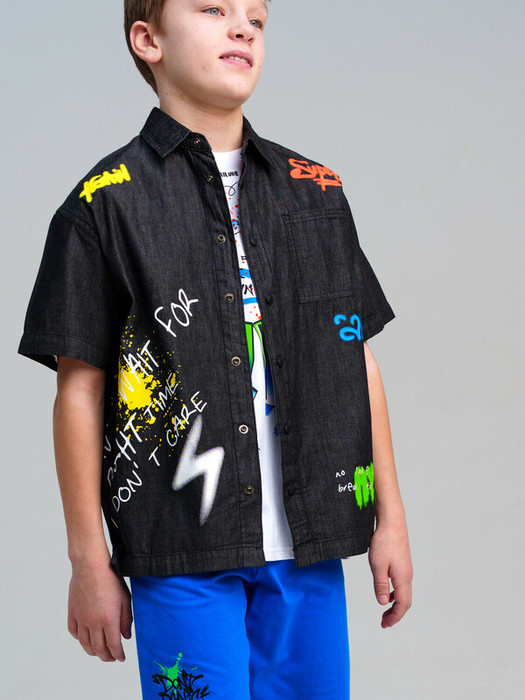 Джинсовая рубашка для мальчика подростка. Оверсайз силуэт. Застежка на кнопки. Функциональный нагрудный карман. Модель выполнена из качественного и плотного текстиля.