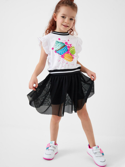 Детская юбка-леггинсы для девочки. Верхняя часть выполнена из легкой сетчатой ткани, под ней — плотные трикотажные укороченные леггинсы. Широкий пояс держится за счёт внутренней резинки. Длина юбки — до середины бедра.