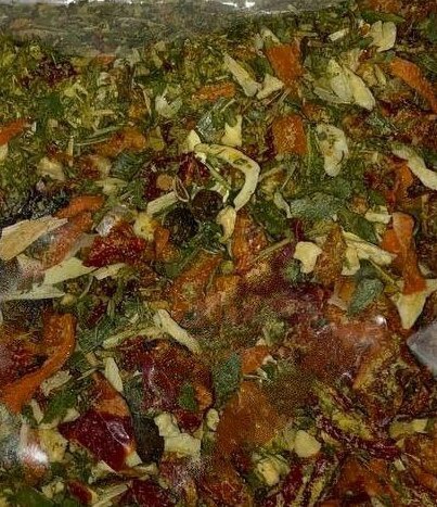 СОСТАВ: лук, морковь, томаты, перец красный сладкий, сахар, укроп, петрушка, пастернак, сельдерей, перцы: черный, душистый, лавровый лист, кориандр, куркума, цедра лимона.