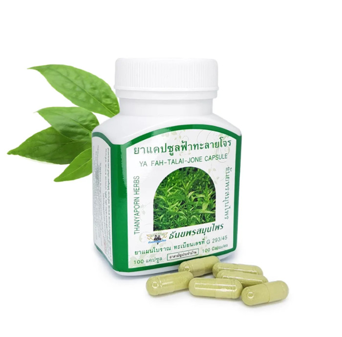 Действие капсул Фа Талай Джон:• Разжижает мокроту, убирает сухость в горле, понижает температуру.• Оказывает вяжущее, противовоспалительное, антибактериальное, антитромботическое действие.• Очищает кровь от вирусов, защищает печень, повышает иммунитет.