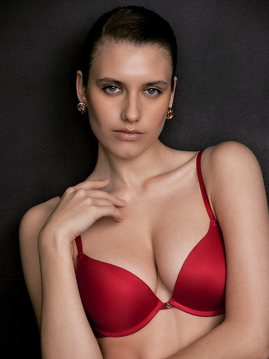 Гладкий бюстгальтер «Push-Up» из микрофибры с уплотненными формованными чашками на косточках. Эффектно приподнимает грудь и придает ей  округлую форму. Узкая перемычка между чашками создает соблазнительную зону декольте. Удобный пояс с застежкой на два крючка и регулируемые бретели обеспечивают комфортную поддержку.