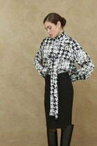 Блузка полуприлегающего силуэта, с втачным рукавом. Застежка центральная на петли и пуговицы. Горловина с воротником рубашечного типа с отрезной стойкой. По линии груди вытачки. Рукав длинный с тремя притачными воланами разной длины.