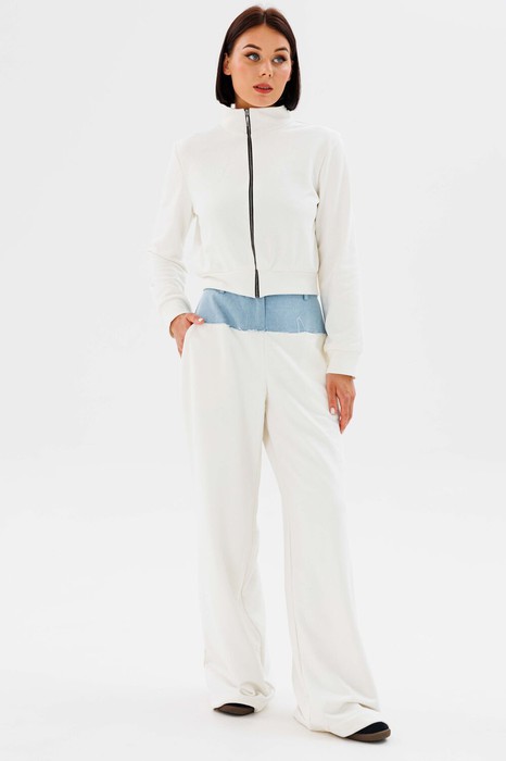 Брюки спортивные, выполнены их трикотажной ткани. пояс и верх брюк выполнн из денима, по середине передей части обработана застежка гульфик с молнией и пуговицей. Деталь из денима по низу не обработан притачныым швом, а имеет необработанный срез с эффектом вытрепанности. посадка брюк -средння по талии, в боковых швах обработаны карманы. брюки очень комфортны в носке