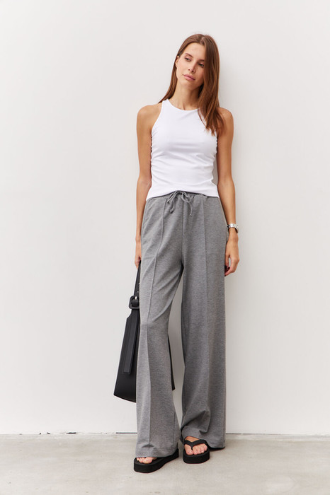 Широкие брюки с отстроченными стрелками по передним деталям. Пояс притачной с эластичной тесьмой и шнурком. В боковых швах обработаны наклонные карманы.