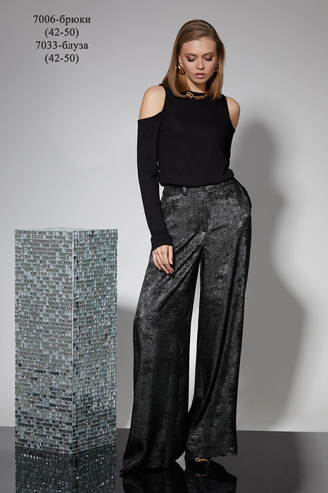 Прямые брюки-палаццо из струящейся вискозы. Брюки на поясе, в который частично вставлена резинка. Функциональные карманы в боковых швах. Эти брюки отлично сочетаются с жилетами, укороченными джемперами и блузами, а так же прекрасно дополняют образ в сочетании со свободным жакетом в стиле Casual.