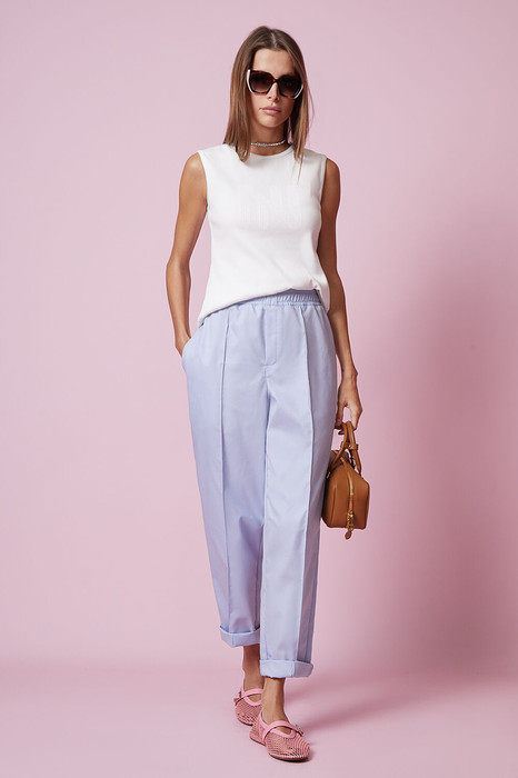 Летние укороченные брюки из фактурного хлопка ,  немного зауженные  книзу. Брюки без  застежки.   Карманы в  боковых    швах. По талии декоративная    резинка . По переду застрочены декоративные канты.