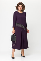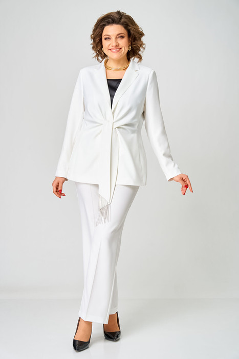 Костюм состоит из жакета и брюк, выполнен из гладкоокрашенной ткани. Жакет полуприлегающего силуэта, на подкладке. Полочка жакета с вертикальными рельефами, с застежкой на две петли и пуговицы. Воротник стояче-отложной пиджачного типа, лацканы отложные. В области талии по центру полочки обработан декоративный элемент в виде цельного пояса, завязывающегося спереди. На концах пояса втачана декоративная тесьма в виде бахромы с бусинами. Спинка со средним швом и вертикальными рельефами. Брюки со стрелками, в верхней части прилегающие к бедрам, в колене и по низу свободные. Брюки на притачном поясе с эластичной тесьмой и застежкой на петлю и пуговицу