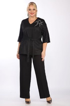 Костюм женский состоящий из юбка-шорт и блузы, блуза асимметричного кроя выполнена из сочетания тканей компаньонов льна-Вишера. Изделие с втачным рукавом и одним открытым плечом, горловина изделия округлая. Юбка-шорты на притачном поясе с резинкой, застежка молния на гульфике и кнопки. На отлетной детали шорт расположен накладной карман. изделие декорировано термопечатью.