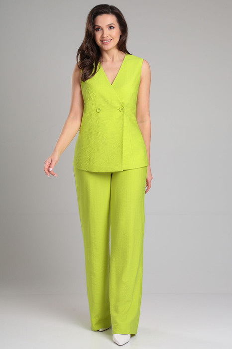 Комплект женский состоящий из жилета и брюк. Жилет приталенного силуэта на х/б подкладке. Перед с вертикальными рельефами из проймы. По спинке средний шов и рельефы из проймы. Без воротника. Застежка центральная бортовая смещенная застегивающаяся на 2 декоративных пуговицы.