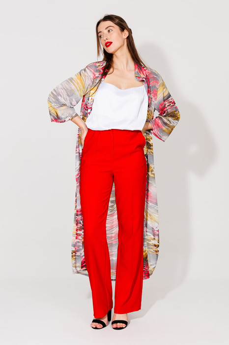 Костюм трехпредметный: состоит из топа, кардигана и брюк.Кардиган прямого кроя с акцентным принтом. Горловина обработана рубашечным воротником с отрезной стойкой. Модель со слегка приспущенной линией плеча и рукавами длиной 7/8. Застёжка центральная на петли и пуговицы. По низу изделия разрезы. Топ на регулируемых бретелях с полукруглым вырезом. Брюки прямого кроя, с карманами.По переду боковой карман, застежка на тесьму-молнию и пуговицу. По спинке верхний срез представлен резинкой.