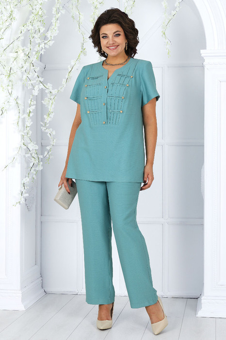 Комплект брючный 2-х предметный, состоящий из блузки и брюк. Блузка полуприлегающего силуэта, выполнена из вискозного полотна. Модель с плечевыми накладками и разрезами в боковых швах. Перед декорирован вставками с застроченными вертикальными защипами и отрезными фигурными планками, застегивающимися на 3 петли и 3 пуговицы. От планок к швам притачивания вставок направлены навесные петли, застегнутые на пуговицы. Спинка со средним швом; круглая горловина спинки обработана отрезной фигурной бейкой. Рукав короткий, втачной. Длина блузки – 66,5 (46-50 р-р) см, 69 см (52-60 р-р); длина рукава – 19,5 см (46-50 р-р), 20,0 (52-60 р-р) см. Брюки классические, с посадкой на талии, выполнены из вискозного полотна. Модель с центральной застёжкой на тесьму-«молнию», на притачном поясе, застегивающемся на петлю и пуговицу. Передние и задние половинки брюк с талиевыми вытачками, направленными от пояса вниз. Спереди обработаны боковые наклонные карманы. Для лучшего прилегания брюк в области талии в поясе по задним половинкам вставлена эластичная лента. Длина брюк по боковому (с поясом) – 101,5 см (46-50 р-р), 102,5 см (52-54 р-р), 103,5 см (56-60 р-р).