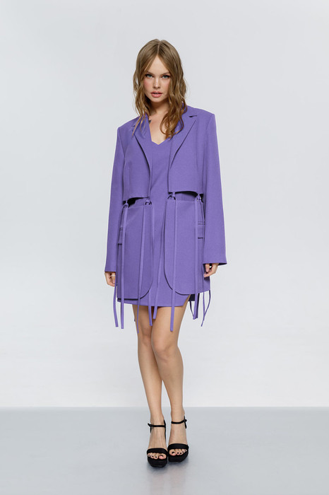 Текстильный комплект-двойка из свободного жакета с отделкой и мини-платья на бретелях с асимметричным низом. Детали: жакет прямого силуэта, пиджачный воротник, талиевые вытачки, прорезные карманы с клапанами, спинка со средним швом, рукава втачные двухшовные, жакет на подкладке. Платье прилегающего силуэта, рельефы, талиевые вытачки, глубокий вырез переда и спинки, спинка со средним швом и застежкой на потайную молнию, фигурный низ, платье на подкладке