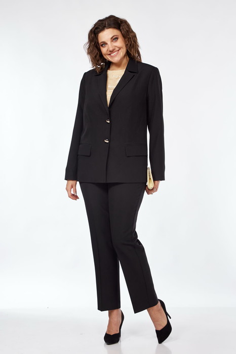 Костюм женский 2-х предметный полуприлегающего силуэта, состоит из жакета и брюк из костюмной ткани. Жакет на подкладке. Жакет с центральной бортовой застёжкой на 2 петли-пуговицы до линии перегиба лацкана. Детали переда с отрезными бочками, горизонтально расположенными боковыми прорезными карманами с клапанами и нагрудными вытачками от разрезов карманов. Спинка со средним швом. Рукав втачной, двухшовный, длинный. Воротник пиджачного типа, углы воротника длиннее, чем лацканов. Брюки прямые, слегка зауженные к низу, с застёжкой на тесьму - молнию в средних срезах передних половинок на гульяик и откосок. Брюки с притачным поясом, застёгивающимся на 1 петлю-пуговицу и с резинкой по задним половинкам брюк. По передним и задним половинкам заутюженные стрелки. Длина жакета по спинке - 66 см. Длина рукава - 60 см. Длина брюк по боковому шву - 99 см.