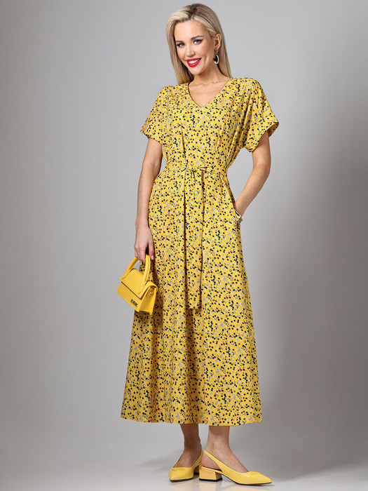 Длинное летнее платье желтого цвета выполнено из плательной ткани, обеспечивающей комфорт в жаркую погоду. Модель имеет А-силуэт, который создает женственный и свободный крой, подходящий для разных типов фигур, включая большие размеры. V-образный вырез горловины добавляет образу элегантности, а короткие рукава обеспечивают удобство в летний период. Декоративный пояс подчеркивает талию, позволяя регулировать посадку по фигуре. Платье предназначено для повседневной носки и сочетается с различными аксессуарами и обувью. Уход за изделием требует бережной стирки при температуре 30 градусов, что помогает сохранить качество ткани и форму платья. Желтый цвет делает модель универсальной и подходящей для разных случаев, от прогулок до неформальных встреч. А-силуэт платья создает плавные линии, визуально вытягивая фигуру.