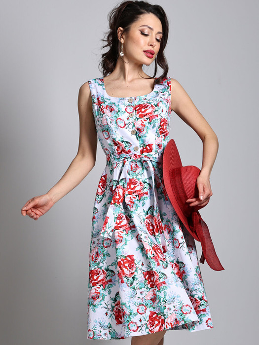 Летнее платье-сарафан с цветочным принтом выполнено из сатина — легкой и приятной к телу ткани. Прилегающий верх с рельефным кроем на груди и застежкой на молнию подчеркивает расклешенность юбки и все это создает вечно актуальный силуэт нью-лук, женственный и элегантный. В комплекте к платью прилагается пояс.Модель подходит для повседневной носки, а также для офиса. Платье представлено в больших размерах, что делает его универсальным выбором для разных типов фигур. Уход за изделием прост: рекомендуется бережная стирка при температуре 30 градусов. Цветочный принт добавляет образу легкости и свежести, делая платье стильным вариантом для летнего сезона.