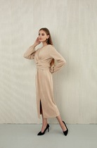 Платье комбинированное с имитацией запаха на лифе, с нагрудными вытачками, цельнокроеным коротким рукавом обработанным манжетой и декорированной патой. Платье отрезное по линии талии. Юбка с декоративными клапанами, средний шов переднего полотнища переходит в разрез. По переду платья приталивается при помощи шнурка вдетого в кулиску, а по спинке при помощи эластичной тесьмы. Платье украшено на груди декоративным элементом.