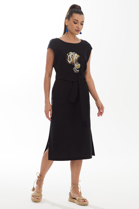 Платье женское прямое длиной до середины икры. Изделие изготовлено из натуральной ткани. Рукав короткий, фантазий ной формы. Украшением платья является красивая вышивка. В боковых швах имеются разрезы и функциональные карманы. Это платье можно носить с широким поясом и без него.