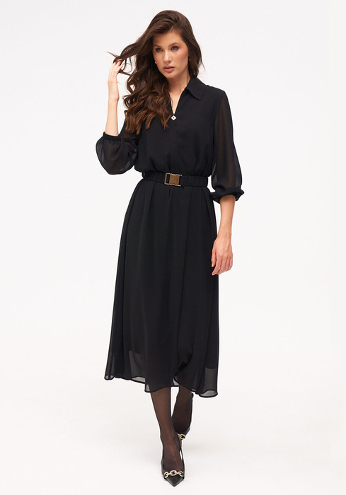Платье А-образного силуэта длины миди из струящегося шифона. Длина рукава 7/8 с низом на резинке. Застёжка на потайную молнию спереди. Комплектуется текстильным ремнём на резинке с металлической пряжкой.