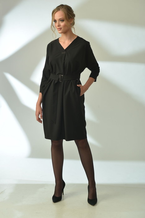 Платье свободного силуэта с цельнокроеным и отрезным рукавом. Перед с V-образным вырезом и центральной складкой. Боковой шов переходит на перед. Платье с карманами в боковых швах и съёмным поясом из основной ткани.