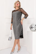 Платье трапециевидного силуэта с кокеткой из сетки по переду. Перед платья и рукава выполнены из кружевной ткани. Спинка платья со встречной складкой выполнена из легкой плательной ткани. Шов по центру спинки сверху украшен пришивными стразами. Рукав втачной, длиной до локтя. Платье на подкладке из натуральной ткани.