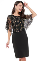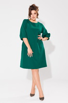 Платье женское прилегающего силуэта, выполнено из трикотажного полотна «велюр». Модель на трикотажной подкладке, без плечевых накладок. Рельефы переда и спинки направлены от плечевого шва до низа. Боковые и рельефные швы в нижней части дополнены объемными вставками-воланами. Фигурная кокетка переда и вставки выполнены из фатина. Горловина платья оформлена стойкой, состоящей из двух частей с закругленными концами. В среднем шве спинки расположена застежка на тесьму-«молнию» (50 см). Рукав длинный втачной, с объемным окатом за счет сборки и жесткого подокатника. Низ рукава сосборен эластичной лентой. Длина платья-116 см, длина рукава-65 см.
