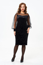 Платье женское полуприлегающего силуэта. Перед и спинка платья 2-х слойные: верхний слой выполнен из гипюра, нижний – из атласа. Длина по среднему шву спинки 108 см. Перед платья, в верхнем и нижнем слоях, с нагрудными вытачками, выходящими из проймы. Спинка, в нижнем слое с талиевыми вытачками, со средним швом, в верхней части которого обработана застежка на потайную тесьму-" молнию", в нижней – разрез. Низ переда и спинки платья из гипюра оформлен фестонами. Вырез горловины переда и спинки округлый, углубленный по переду. Рукава втачные, формы "крылышко на запах", со скругленными срезами, выполнены из шифона. Длина рукава 41 см. Платье с плечевыми накладками.