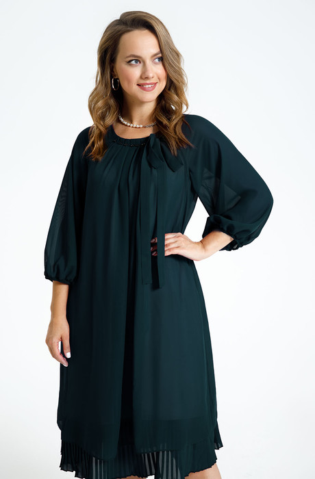 Нарядное платье трапециевидного силуэта с рукавом реглан. Рукав прямой, низ на резинке. Низ платья оформлен рюшей из плиссированной ткани. Вырез горловины круглый с заложенными вокруг нее складками, декорирован завязывающимся бантом и пришивными стразами. Платье выполнено на подкладке.