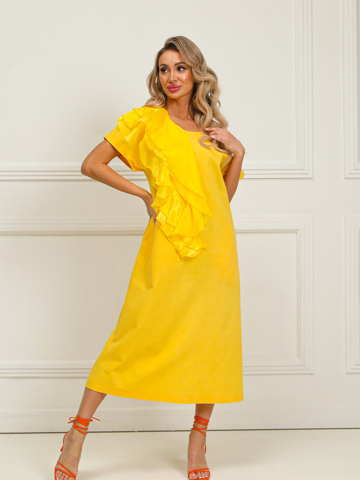 Очаровательное платье прямого силуэта из текстильной ткани желтого цвета. Круглый вырез изделия обработан внутренней обтачкой. Цельнокроеные рукава дополнены отворотом. Перед изделия дополнен широкими оборками из шифона. По бокам изделия - внутренние карманы. Длина изделия по спинке от плечевого шва до низа изделия — см.