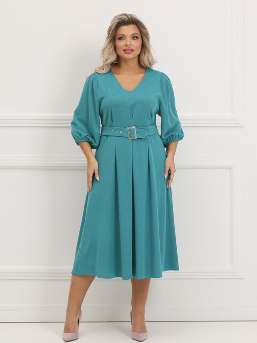 Роскошное платье полуприлегающего силуэта из трикотажного полотна бирюзового цвета. V-образный вырез обработан внутренней обтачкой. Перед изделия дополнен встречными складками. Втачные рукава дополнены сборкой и обработаны окантовкой. В комплект входит пояс с металлической пряжкой. Длина изделия по спинке от плечевого шва до низа изделия — см. Рост фотомодели — 170 см.