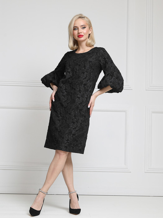 Очаровательное платье прямого силуэта из текстильной ткани с жаккардовым переплетением черного цвета. Круглый вырез изделия обработан внутренней обиачкой. Втачные рукава дополнены буфами. Застежка на потайную молнию по спинке изделия.