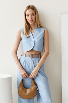 Стильный укороченный жилет из льняного полотна. Модель прямого силуэта. Воротник стойка. Фигурные края борта. По переду и спинке рельефные швы и вытачки. По переду застёжка на петлю и пуговицу. Изделие выполнено на подкладке из тонкого хлопка.