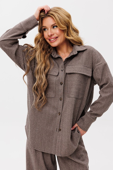 Рубашка свободного силуэта, с центральной бортовой застежкой по переду на петли пуговицы. Воротник отложной стойка. По переду на линии груди накладные карманы с клапанами. Спинка на кокетке. Рукав длинный на манжете.