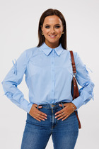Блузка женская прямого силуэта с рубашечным воротником, с рукавом со сборкой по низу на притачном манжете, с застежкой по переду на петли пуговицы.