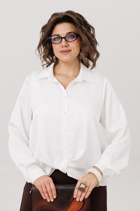 На модели в рубашке цвета «перламутровая жемчужина» топ 1664, юбка-брюки 1783 и атласная юбка 1808.