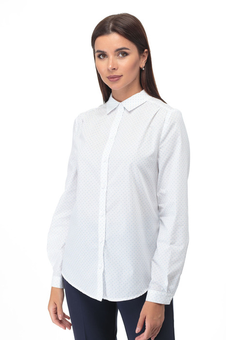 Прямой силуэт, втачной рукав на манжете. Рубашечный воротник на притачной стойке, центральная застёжка по всей длине на пуговицы. По переду от линии кокетки небольшая сборка, по спинке встречная складка.