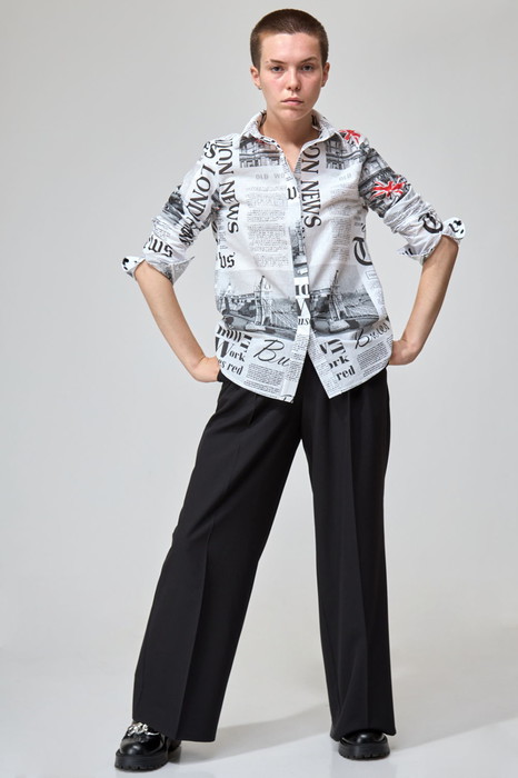 Стильная блузка из хлопковой ткани с принтом "газета" для яркого образа. Подойдет для женщин, девушек и подростков. Отлично сочетается с джинсами и любыми брюками. Натуральная ткань с необычным принтом подойдет для учебы, работы и на каждый день.