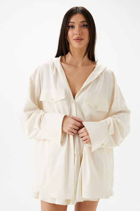 Рубашка прямого свободного кроя, выполнена из текстильного полотна молочного цвета. Характеристика: двойной капюшон, застёжка центральная на пуговицы, по переду на уровне линии груди функциональные карманы с клапаном, рукав свободный спущенный с широкой манжетой на 2 пуговицы. Длина рукава от края горловины 79 см. Длина спинки от края горловины 75 см.