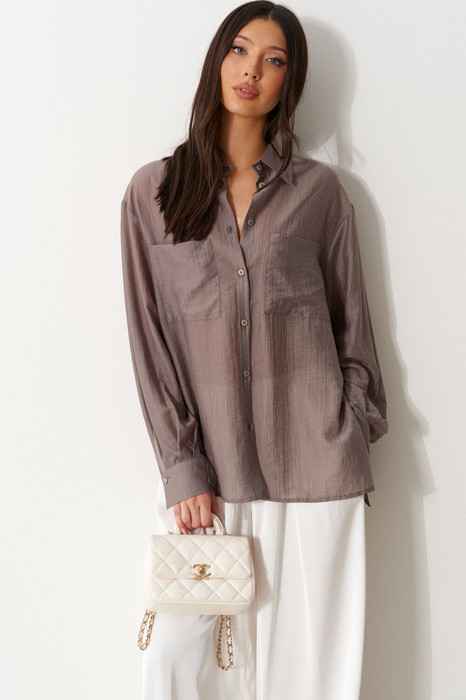 Блузка женская прямого силуэта, свободного облегания. Характеристика: Воротник отложной на стойке. Рукав одношовный, втачной, со спущенной линией плеча. На переде по линии груди настрочены прямоугольные накладные карманы. Спинка цельная. В боковых швах обработаны разрезы. Застежка центральная, цельнокроеная планка, застегивающаяся на пробивные петли, пришивные пуговицы. На манжетах декоративная пуговица. Длина рукава 60 см, длина плеча 20 см, длина блузы по спинке 69 см.