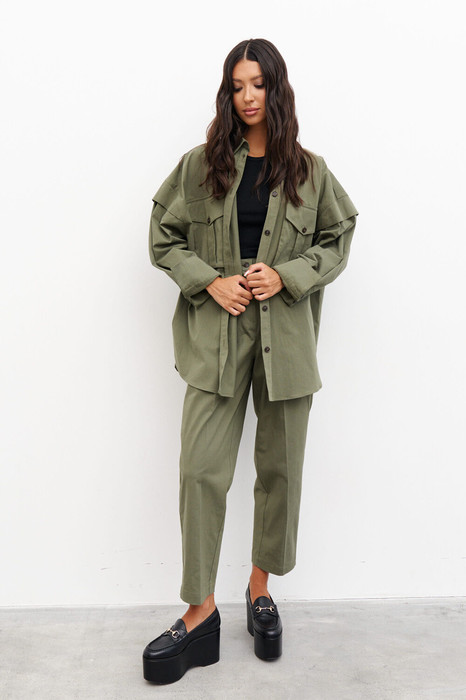 Рубашка прямого свободного кроя. Характеристики: отложной воротник, застежка центральная - петли пуговицы, рукав спущен: по окату рукава вставлен декоративный эленент "крыло", по низу рукава манжета на пуговицах, по переду изделия крупные карманы с лацканом, спинка отрезная с декоративной сборкой, низ в изделии с плавным срезом. Длина по спинке 76 см, длина рукава 54 см.