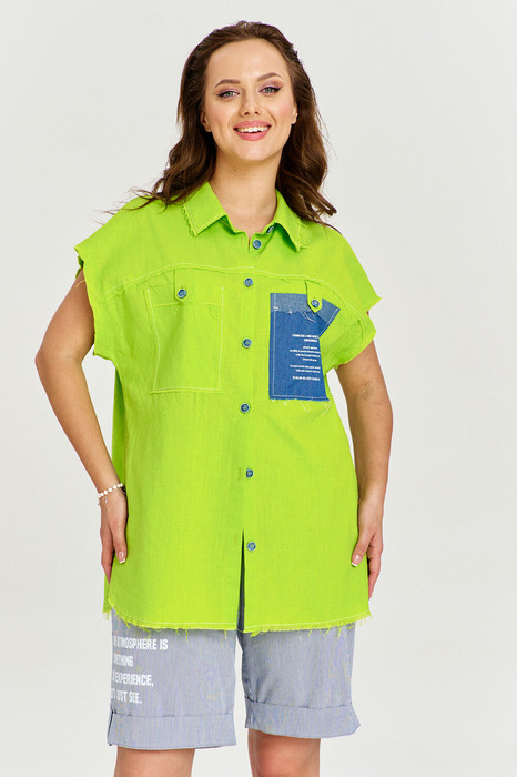 Рубашка из льняной ткани, свободного силуэта, удлиненной спинкой, застежкой на пуговицы спереди и рубашечным воротником. Спинка с отрезной кокеткой и бантовой складкой. Рукав короткий, цельнокроеный. На переде отрезные кокетки и накладные карманы с авторским принтом. Некоторые швы изделия необработаны, при энзимной стирке обретают стильную вытрепанность.