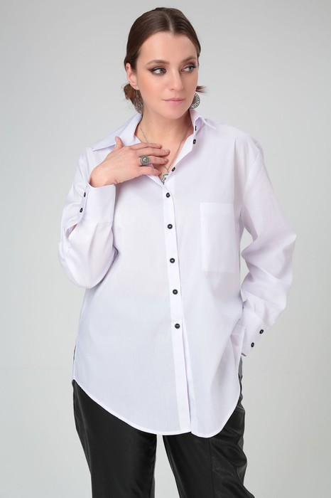 Рубашка прямого силуэта подходит под любые формы и типы фигуры. На левой полочке расположен карман. По спинке имеется кокетка с пришивными пуговицами чёрного цвета. Эффектный образ создается за счет необычных деталей и элементов. Ассиметричные манжеты и чёрные пуговицы фишка этой рубашки. Белая рубашка– это не только стильно, но и эффектно, а ещё и удобно. Прямой силуэт, который стройнит и белый цвет сочетается со всей палитрой одинаково классно. Добавляем эту рубашку к любому “низу” образ готов. Модель OverSize. Длина по переду 79 см. Длина рукава от воротника 75 см. Длина по спинке от воротника 79 см.